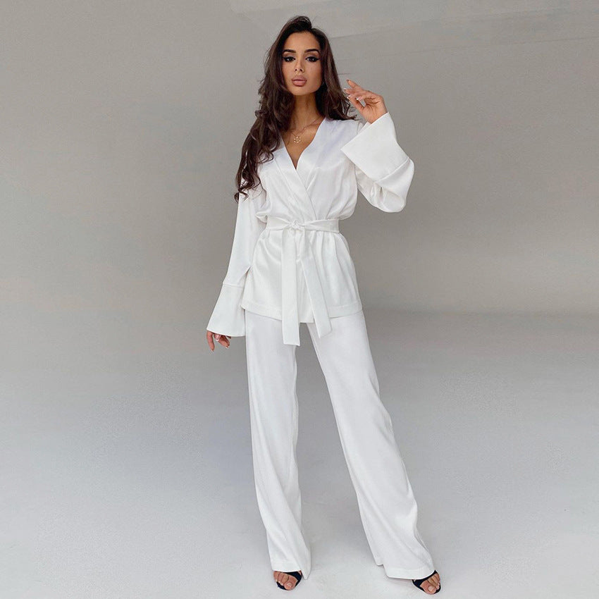 Elevate your loungewear game with the PJJAYS Ice Silk Robe Blouse and Pants Pajamas. Made from luxurious ice silk, this high-end lounge set is perfect for relaxing in style. With a comfortable cardigan strap and flattering fit, you'll feel both comfortable and chic. Upgrade your loungewear collection with this must-have set.